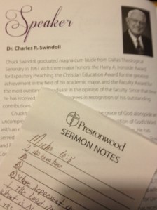 We were blessed to hear a message by Dr. Charles R. Swindoll – more commonly know as Chuck Swindoll. Chuck is known to many as Pastor, Author and radio broadcaster/teacher. Chuck is also a graduate of DTS and has served as the seminary president and chancellor.
